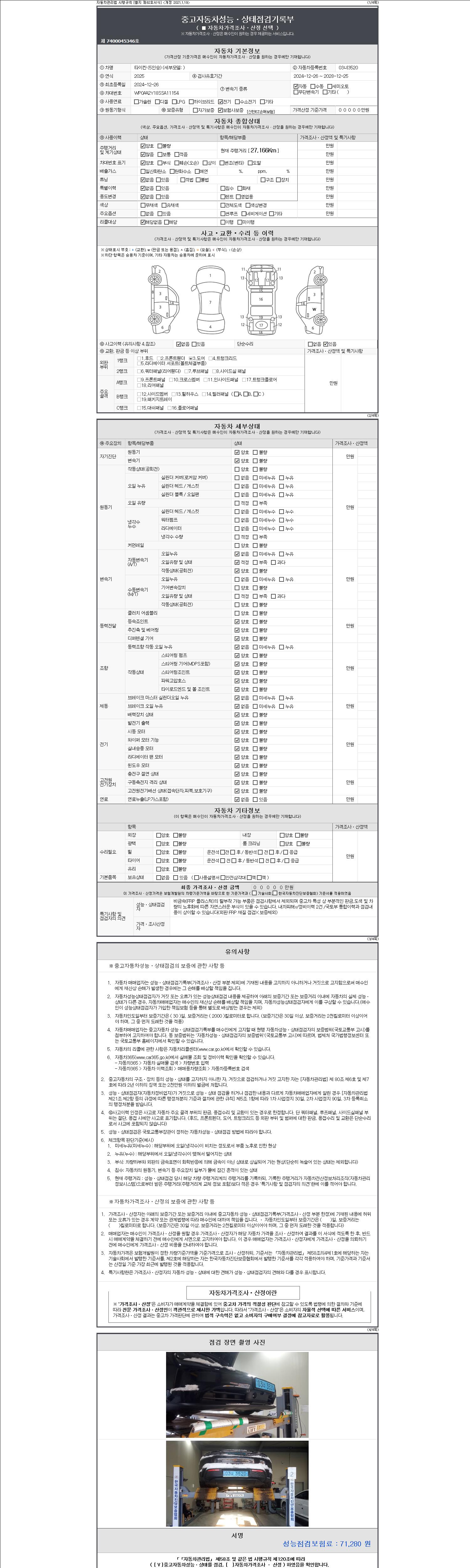 자동차관리법 시행규칙 제120조의 규정에 따라 별지 제 82호서식 《중고자동차 성능, 상태점검 기록부》를 발행한 성능, 상태점검자 및 매매자는 아래의 보증기간 또는 보증거리 이내의 중고자동차, 성능점검 기록부에 기재된 내용과 자동차의 실제 성능, 상태가 다른 경우 계약 또는 관계법령에 따라 매수인에 대하여 책임을 집니다.