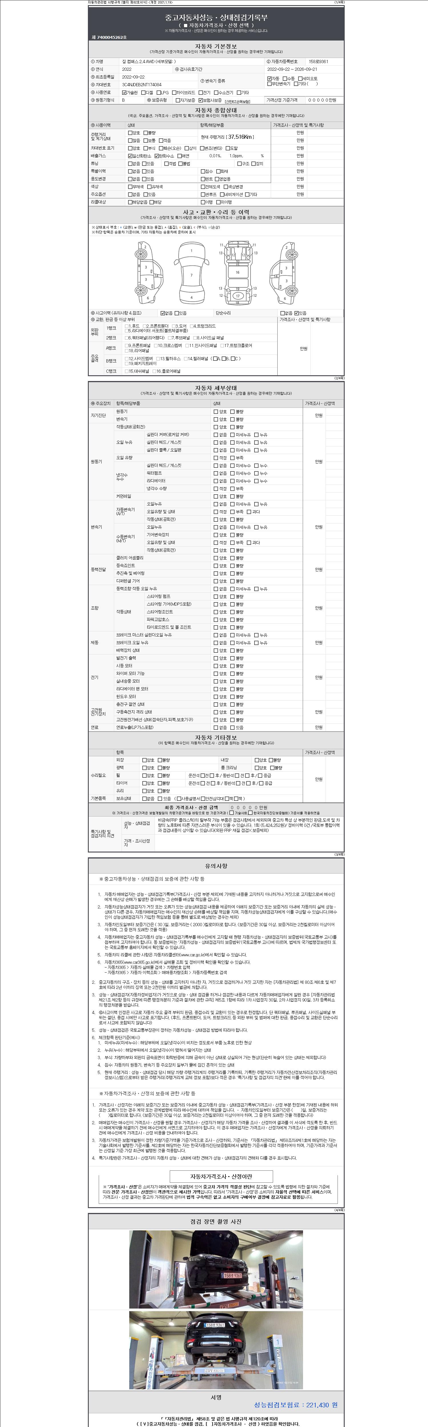 자동차관리법 시행규칙 제120조의 규정에 따라 별지 제 82호서식 《중고자동차 성능, 상태점검 기록부》를 발행한 성능, 상태점검자 및 매매자는 아래의 보증기간 또는 보증거리 이내의 중고자동차, 성능점검 기록부에 기재된 내용과 자동차의 실제 성능, 상태가 다른 경우 계약 또는 관계법령에 따라 매수인에 대하여 책임을 집니다.
