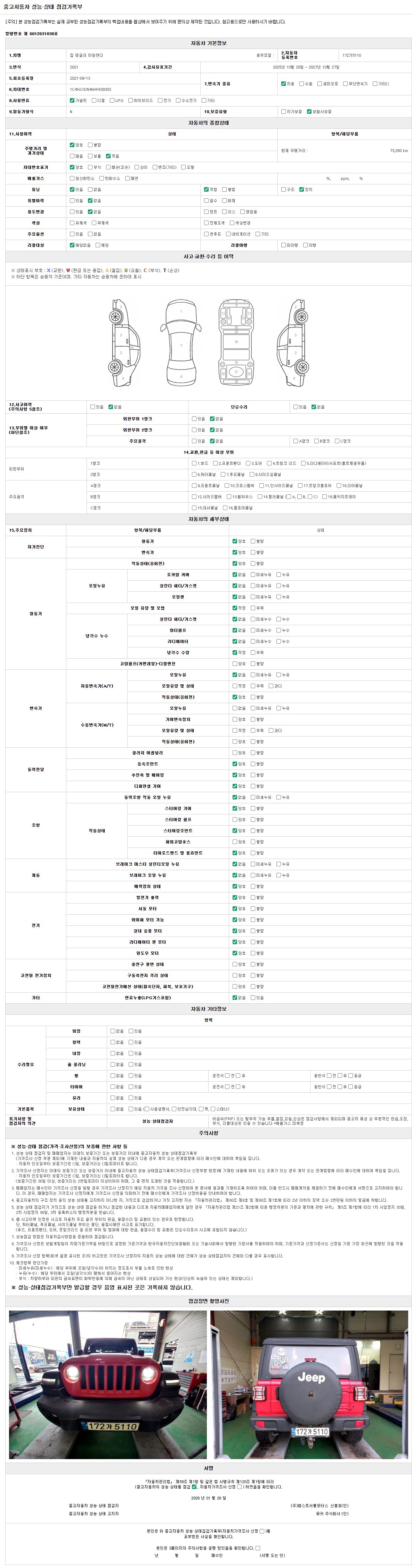 자동차관리법 시행규칙 제120조의 규정에 따라 별지 제 82호서식 《중고자동차 성능, 상태점검 기록부》를 발행한 성능, 상태점검자 및 매매자는 아래의 보증기간 또는 보증거리 이내의 중고자동차, 성능점검 기록부에 기재된 내용과 자동차의 실제 성능, 상태가 다른 경우 계약 또는 관계법령에 따라 매수인에 대하여 책임을 집니다.