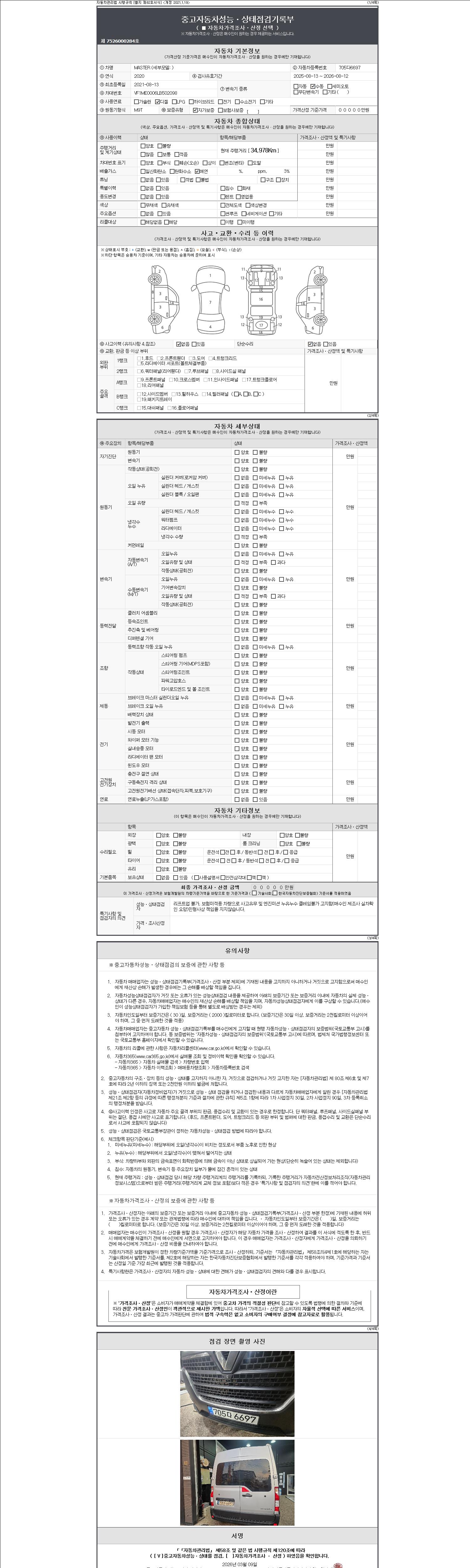 자동차관리법 시행규칙 제120조의 규정에 따라 별지 제 82호서식 《중고자동차 성능, 상태점검 기록부》를 발행한 성능, 상태점검자 및 매매자는 아래의 보증기간 또는 보증거리 이내의 중고자동차, 성능점검 기록부에 기재된 내용과 자동차의 실제 성능, 상태가 다른 경우 계약 또는 관계법령에 따라 매수인에 대하여 책임을 집니다.