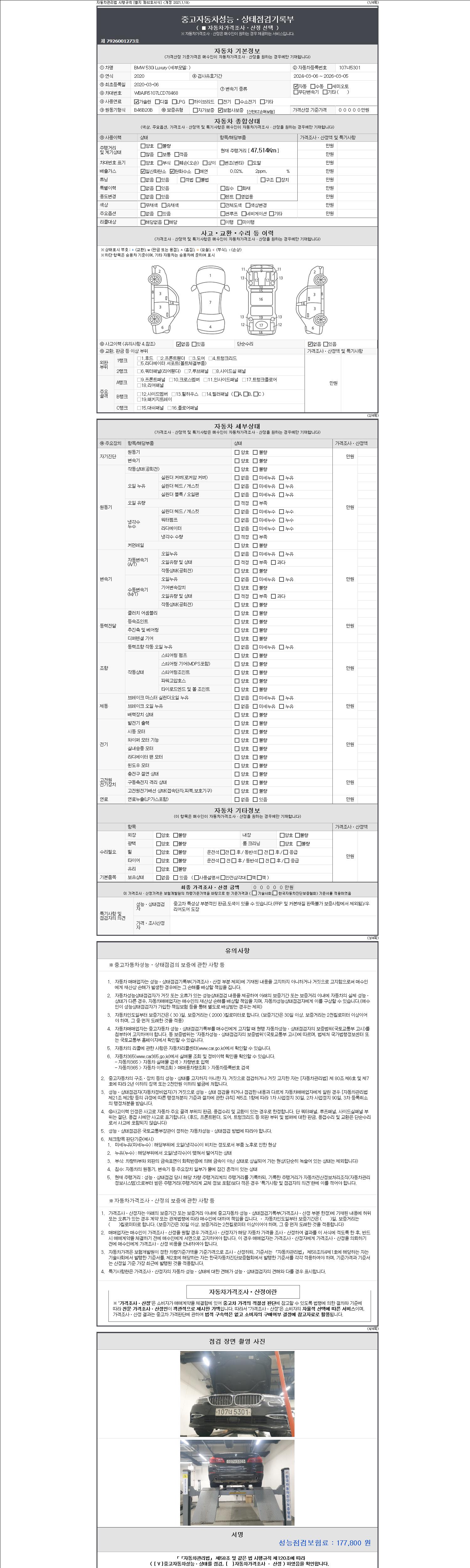 자동차관리법 시행규칙 제120조의 규정에 따라 별지 제 82호서식 《중고자동차 성능, 상태점검 기록부》를 발행한 성능, 상태점검자 및 매매자는 아래의 보증기간 또는 보증거리 이내의 중고자동차, 성능점검 기록부에 기재된 내용과 자동차의 실제 성능, 상태가 다른 경우 계약 또는 관계법령에 따라 매수인에 대하여 책임을 집니다.