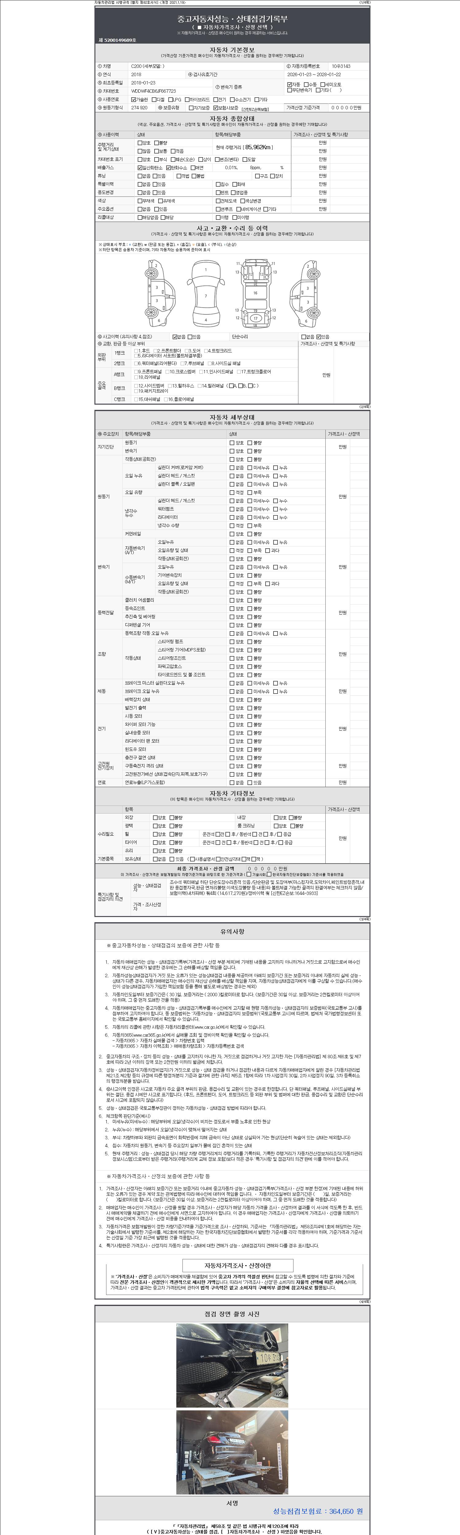 자동차관리법 시행규칙 제120조의 규정에 따라 별지 제 82호서식 《중고자동차 성능, 상태점검 기록부》를 발행한 성능, 상태점검자 및 매매자는 아래의 보증기간 또는 보증거리 이내의 중고자동차, 성능점검 기록부에 기재된 내용과 자동차의 실제 성능, 상태가 다른 경우 계약 또는 관계법령에 따라 매수인에 대하여 책임을 집니다.