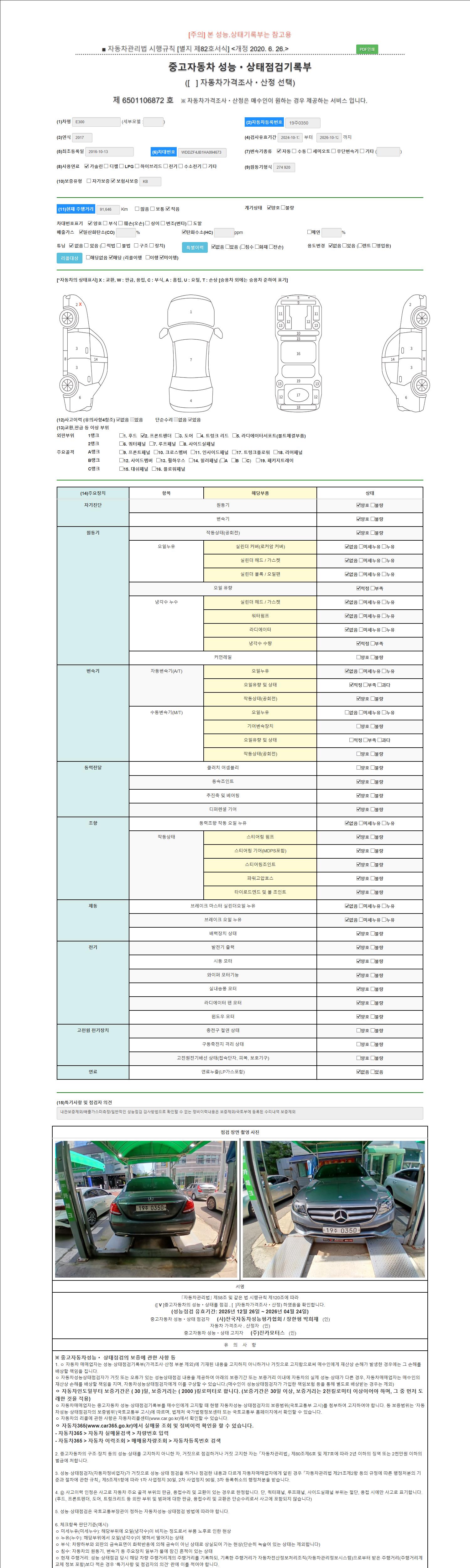 자동차관리법 시행규칙 제120조의 규정에 따라 별지 제 82호서식 《중고자동차 성능, 상태점검 기록부》를 발행한 성능, 상태점검자 및 매매자는 아래의 보증기간 또는 보증거리 이내의 중고자동차, 성능점검 기록부에 기재된 내용과 자동차의 실제 성능, 상태가 다른 경우 계약 또는 관계법령에 따라 매수인에 대하여 책임을 집니다.