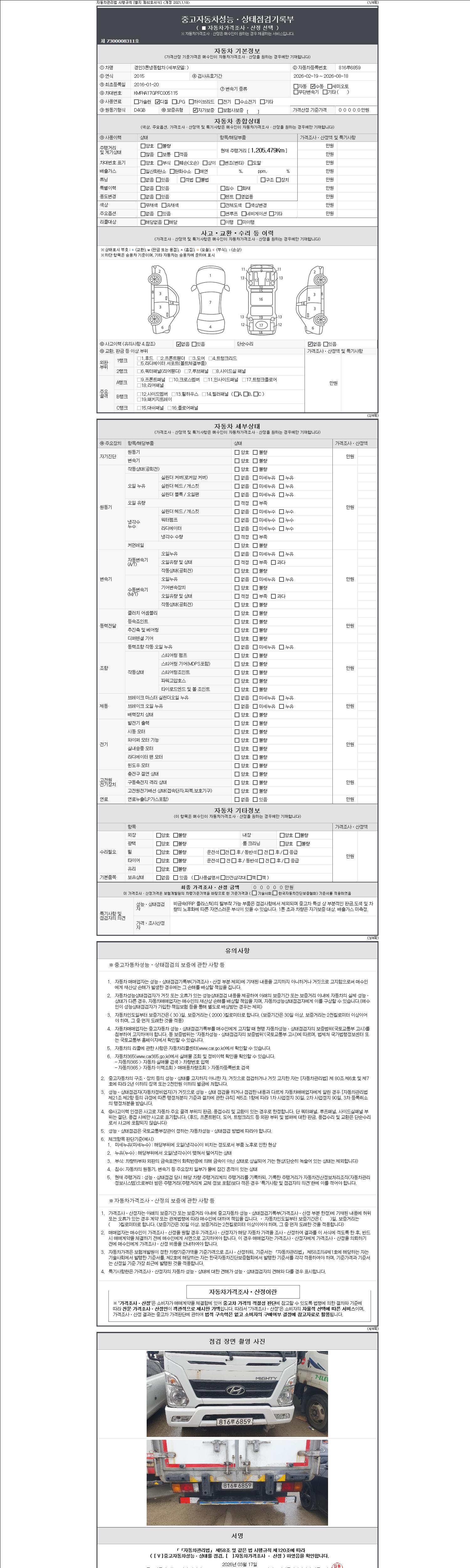 자동차관리법 시행규칙 제120조의 규정에 따라 별지 제 82호서식 《중고자동차 성능, 상태점검 기록부》를 발행한 성능, 상태점검자 및 매매자는 아래의 보증기간 또는 보증거리 이내의 중고자동차, 성능점검 기록부에 기재된 내용과 자동차의 실제 성능, 상태가 다른 경우 계약 또는 관계법령에 따라 매수인에 대하여 책임을 집니다.