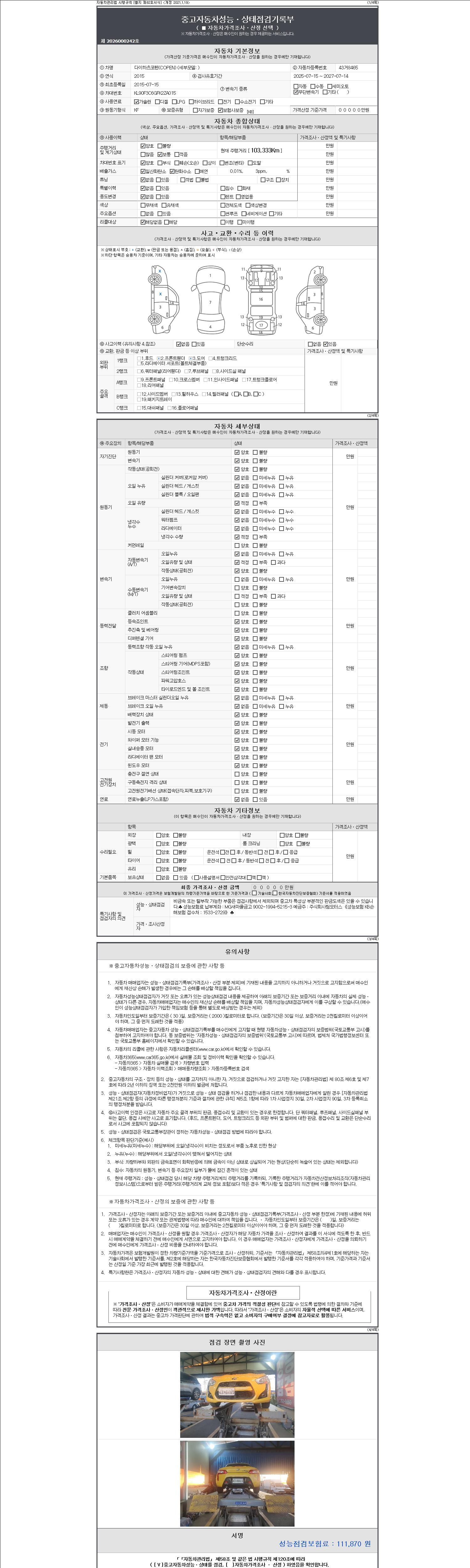 -중고자동차 매매업자를 통해 차량을 구입하실 경우 반드시 "중고자동차 성능, 상태점검 기록부"를 교뷰 받으셔야 하며, 매매업자는 반드시 의무 교부 하여야 압니다.