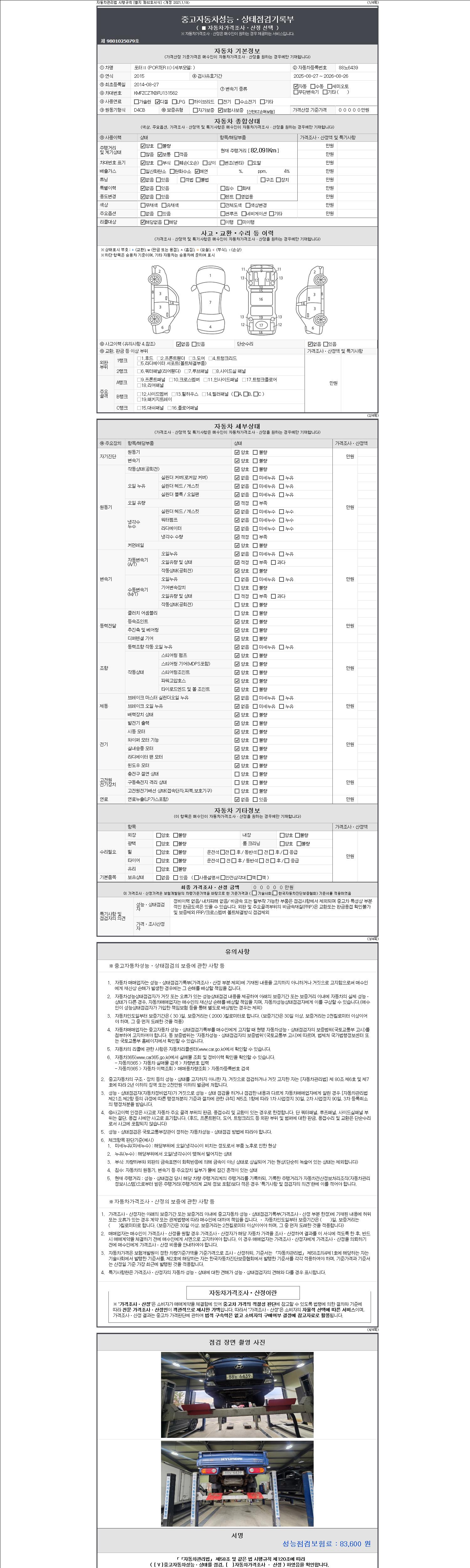자동차관리법 시행규칙 제120조의 규정에 따라 별지 제 82호서식 《중고자동차 성능, 상태점검 기록부》를 발행한 성능, 상태점검자 및 매매자는 아래의 보증기간 또는 보증거리 이내의 중고자동차, 성능점검 기록부에 기재된 내용과 자동차의 실제 성능, 상태가 다른 경우 계약 또는 관계법령에 따라 매수인에 대하여 책임을 집니다.