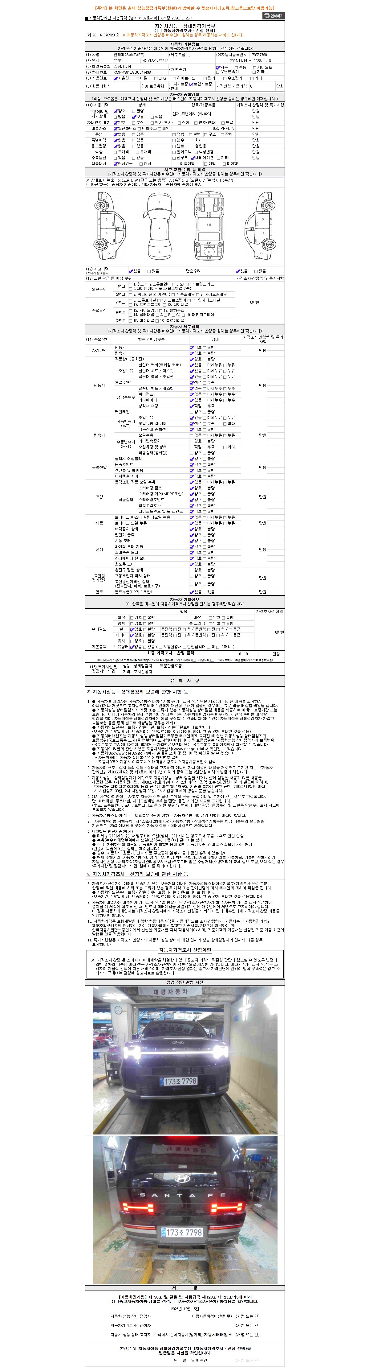 자동차관리법 시행규칙 제120조의 규정에 따라 별지 제 82호서식 《중고자동차 성능, 상태점검 기록부》를 발행한 성능, 상태점검자 및 매매자는 아래의 보증기간 또는 보증거리 이내의 중고자동차, 성능점검 기록부에 기재된 내용과 자동차의 실제 성능, 상태가 다른 경우 계약 또는 관계법령에 따라 매수인에 대하여 책임을 집니다.