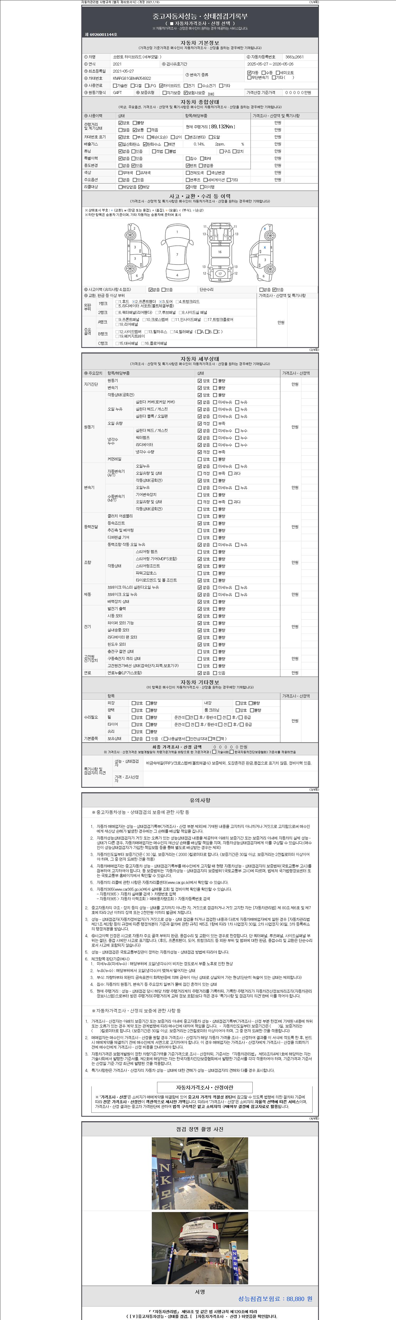 자동차관리법 시행규칙 제120조의 규정에 따라 별지 제 82호서식 《중고자동차 성능, 상태점검 기록부》를 발행한 성능, 상태점검자 및 매매자는 아래의 보증기간 또는 보증거리 이내의 중고자동차, 성능점검 기록부에 기재된 내용과 자동차의 실제 성능, 상태가 다른 경우 계약 또는 관계법령에 따라 매수인에 대하여 책임을 집니다.