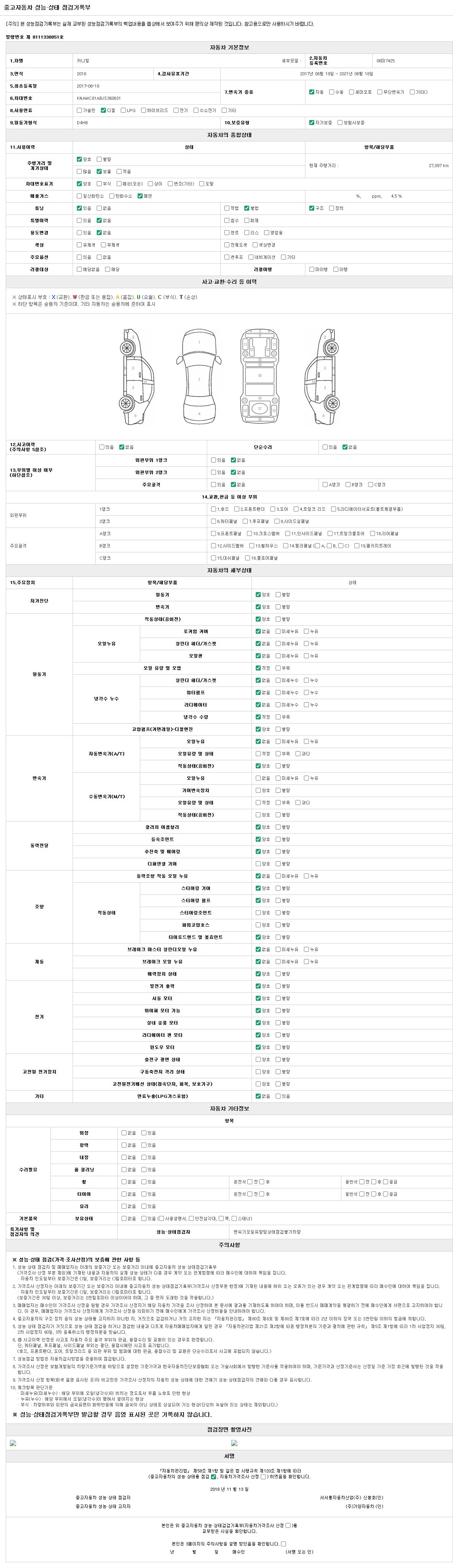 -중고자동차 매매업자를 통해 차량을 구입하실 경우 반드시 "중고자동차 성능, 상태점검 기록부"를 교뷰 받으셔야 하며, 매매업자는 반드시 의무 교부 하여야 압니다.