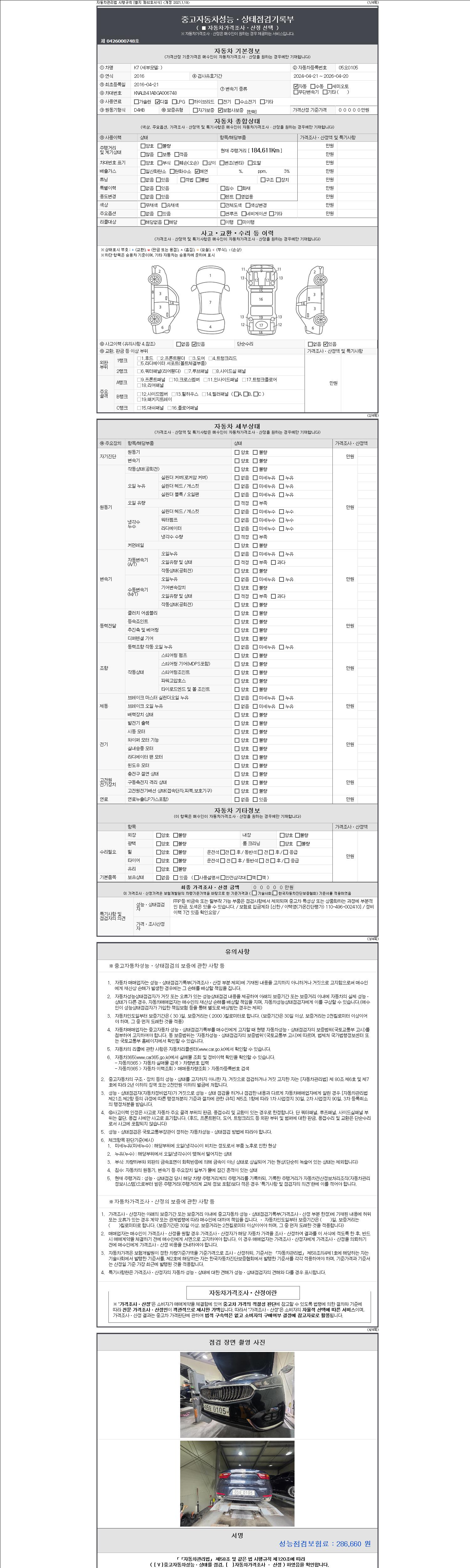 자동차관리법 시행규칙 제120조의 규정에 따라 별지 제 82호서식 《중고자동차 성능, 상태점검 기록부》를 발행한 성능, 상태점검자 및 매매자는 아래의 보증기간 또는 보증거리 이내의 중고자동차, 성능점검 기록부에 기재된 내용과 자동차의 실제 성능, 상태가 다른 경우 계약 또는 관계법령에 따라 매수인에 대하여 책임을 집니다.