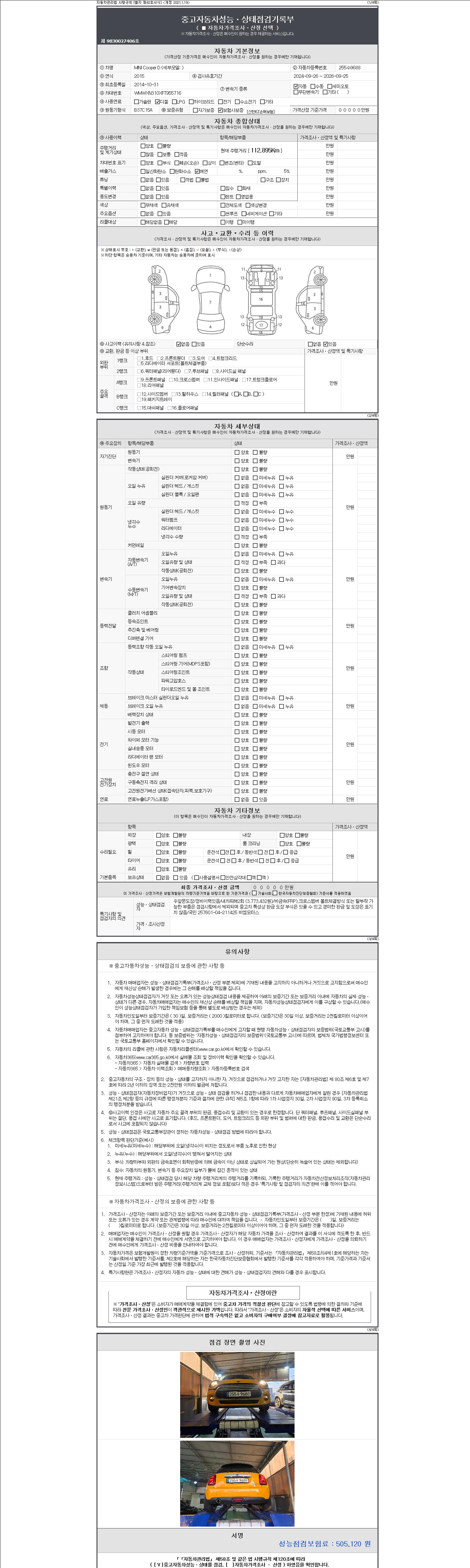 -중고자동차 매매업자를 통해 차량을 구입하실 경우 반드시 "중고자동차 성능, 상태점검 기록부"를 교뷰 받으셔야 하며, 매매업자는 반드시 의무 교부 하여야 압니다.