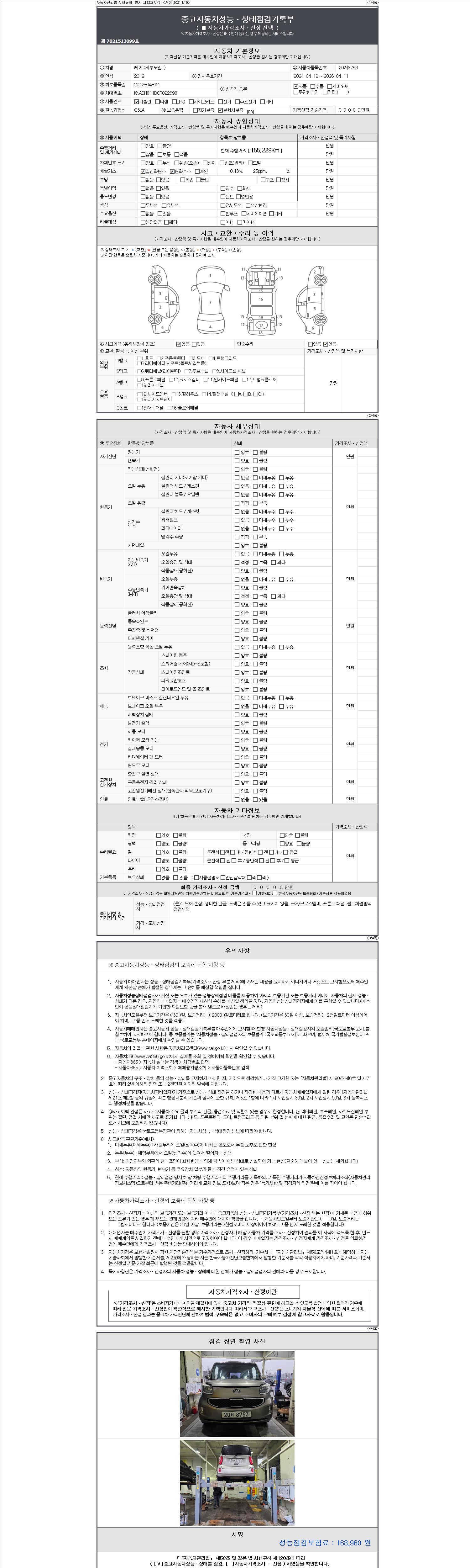 -중고자동차 매매업자를 통해 차량을 구입하실 경우 반드시 "중고자동차 성능, 상태점검 기록부"를 교뷰 받으셔야 하며, 매매업자는 반드시 의무 교부 하여야 압니다.