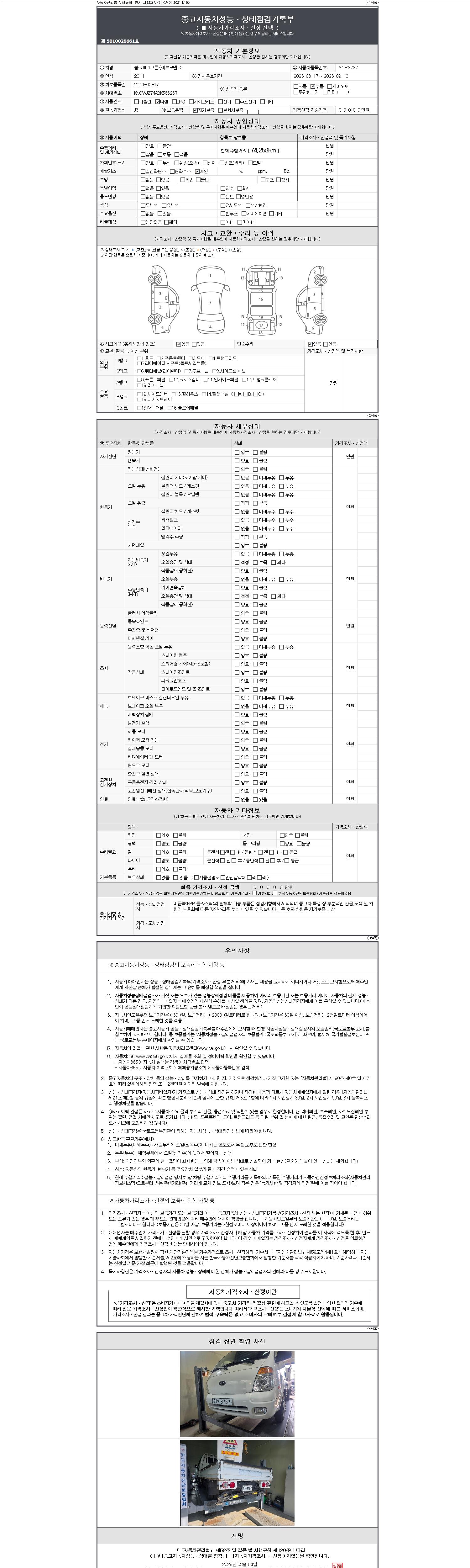 자동차관리법 시행규칙 제120조의 규정에 따라 별지 제 82호서식 《중고자동차 성능, 상태점검 기록부》를 발행한 성능, 상태점검자 및 매매자는 아래의 보증기간 또는 보증거리 이내의 중고자동차, 성능점검 기록부에 기재된 내용과 자동차의 실제 성능, 상태가 다른 경우 계약 또는 관계법령에 따라 매수인에 대하여 책임을 집니다.