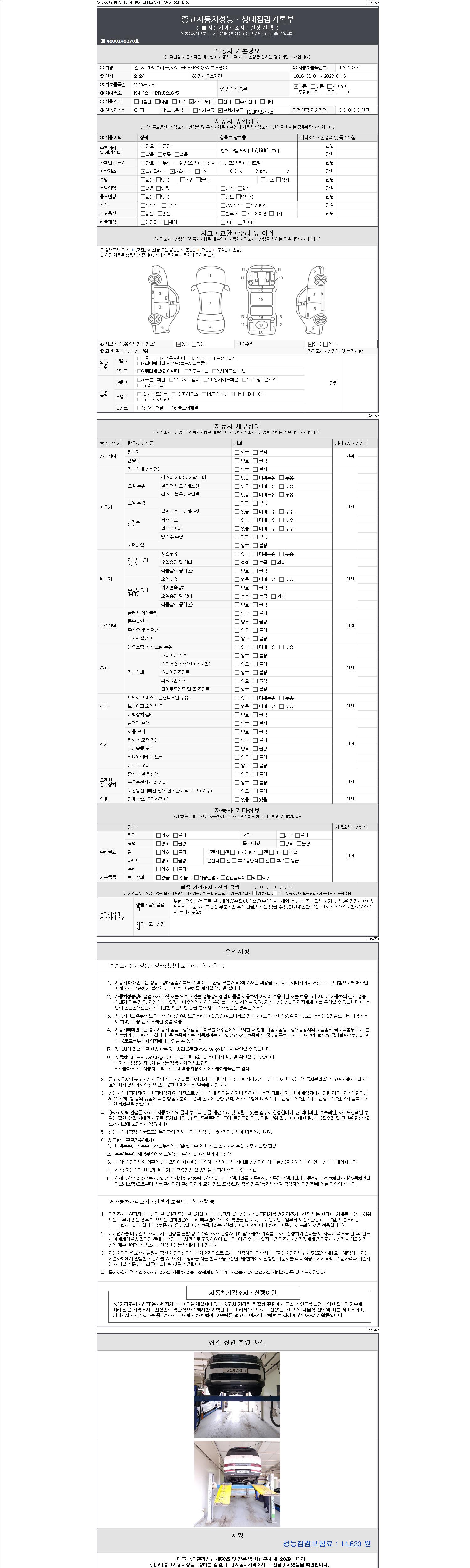 자동차관리법 시행규칙 제120조의 규정에 따라 별지 제 82호서식 《중고자동차 성능, 상태점검 기록부》를 발행한 성능, 상태점검자 및 매매자는 아래의 보증기간 또는 보증거리 이내의 중고자동차, 성능점검 기록부에 기재된 내용과 자동차의 실제 성능, 상태가 다른 경우 계약 또는 관계법령에 따라 매수인에 대하여 책임을 집니다.