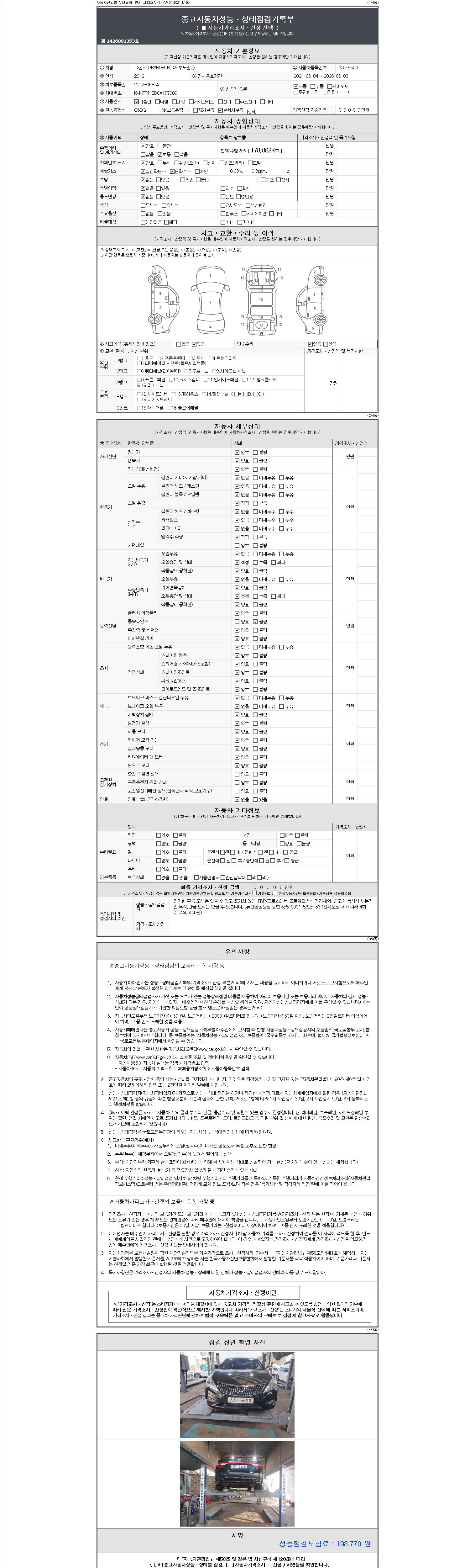 자동차관리법 시행규칙 제120조의 규정에 따라 별지 제 82호서식 《중고자동차 성능, 상태점검 기록부》를 발행한 성능, 상태점검자 및 매매자는 아래의 보증기간 또는 보증거리 이내의 중고자동차, 성능점검 기록부에 기재된 내용과 자동차의 실제 성능, 상태가 다른 경우 계약 또는 관계법령에 따라 매수인에 대하여 책임을 집니다.