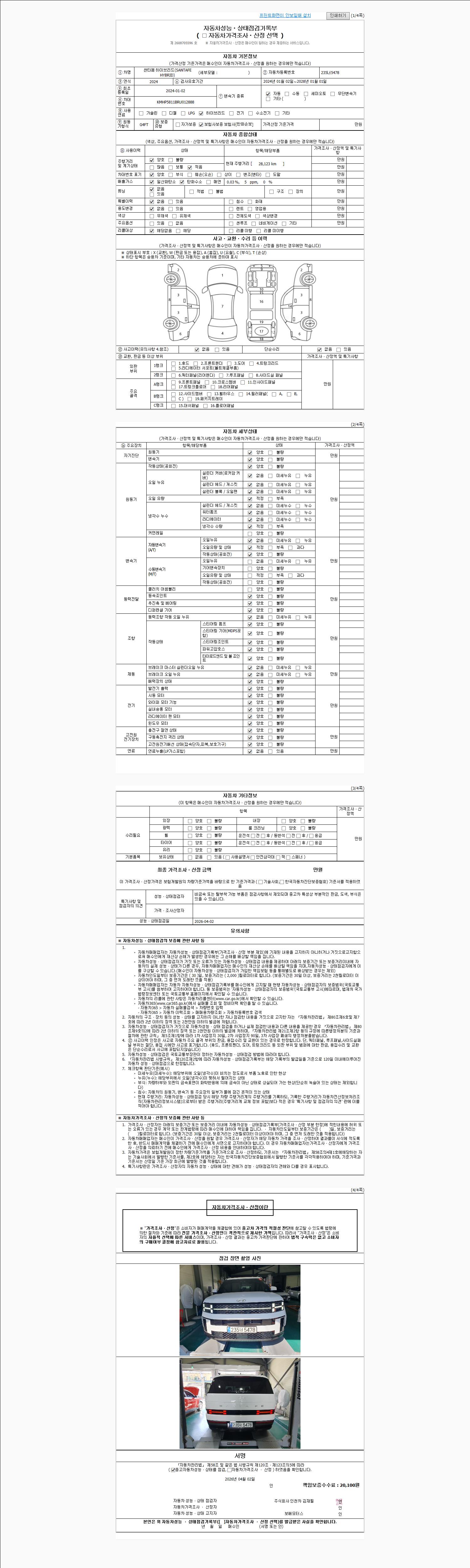 자동차관리법 시행규칙 제120조의 규정에 따라 별지 제 82호서식 《중고자동차 성능, 상태점검 기록부》를 발행한 성능, 상태점검자 및 매매자는 아래의 보증기간 또는 보증거리 이내의 중고자동차, 성능점검 기록부에 기재된 내용과 자동차의 실제 성능, 상태가 다른 경우 계약 또는 관계법령에 따라 매수인에 대하여 책임을 집니다.