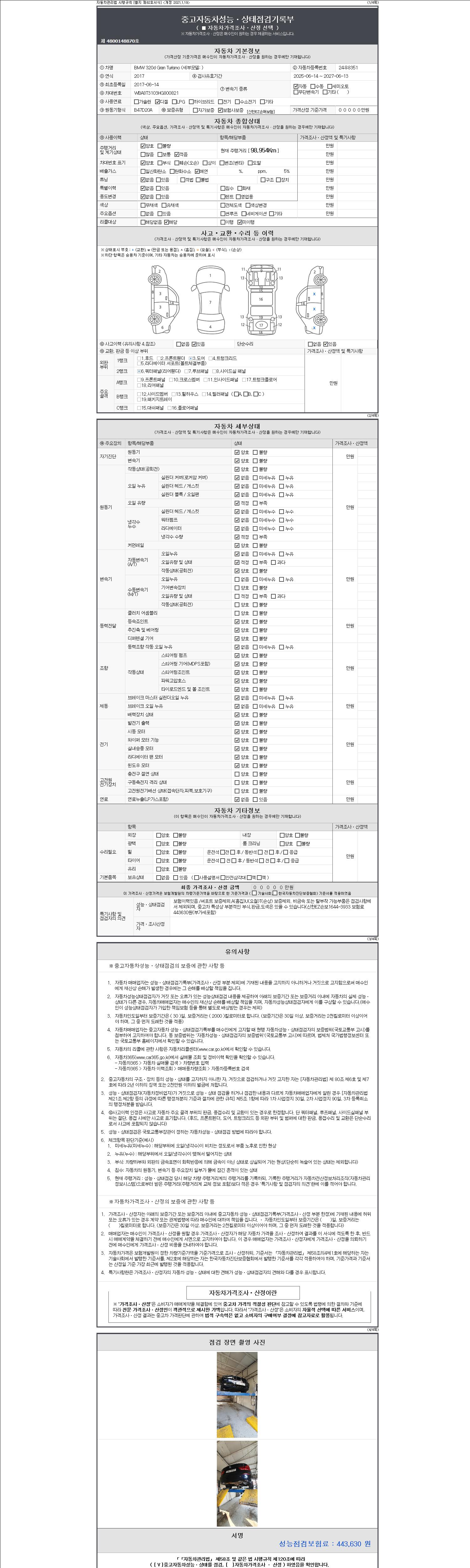 자동차관리법 시행규칙 제120조의 규정에 따라 별지 제 82호서식 《중고자동차 성능, 상태점검 기록부》를 발행한 성능, 상태점검자 및 매매자는 아래의 보증기간 또는 보증거리 이내의 중고자동차, 성능점검 기록부에 기재된 내용과 자동차의 실제 성능, 상태가 다른 경우 계약 또는 관계법령에 따라 매수인에 대하여 책임을 집니다.