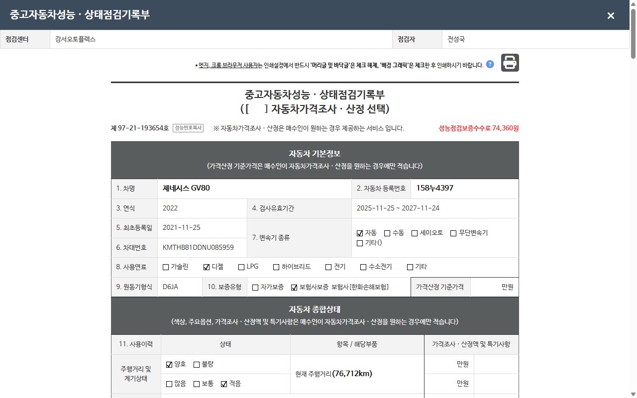 | 주행거리 | 76,712 km | 차량번호 | 158누4397 |