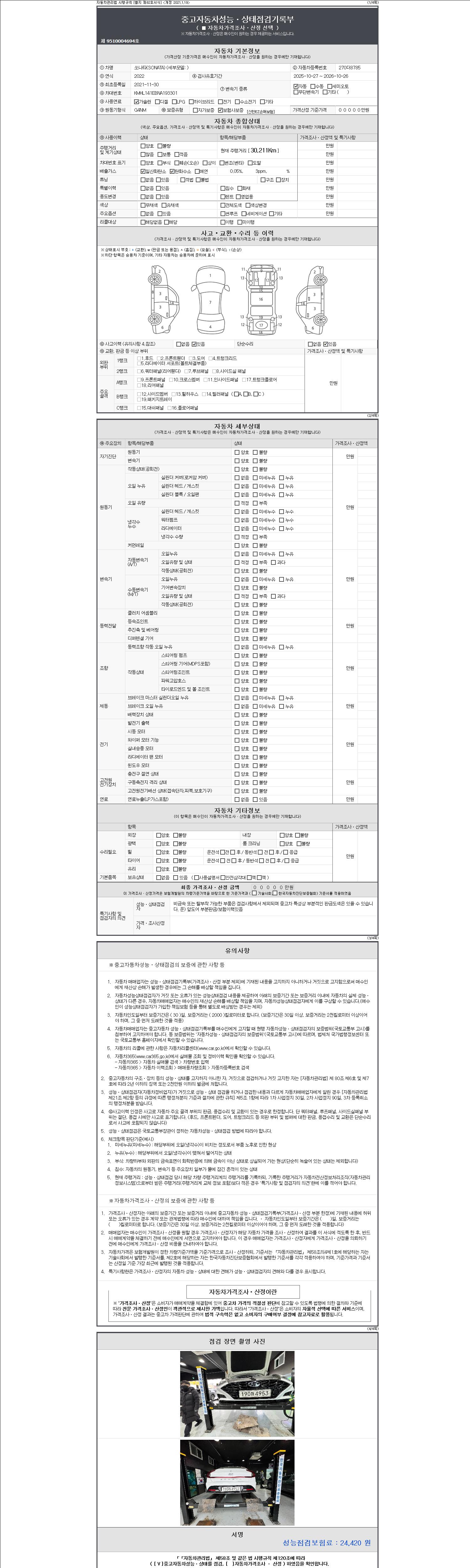 자동차관리법 시행규칙 제120조의 규정에 따라 별지 제 82호서식 《중고자동차 성능, 상태점검 기록부》를 발행한 성능, 상태점검자 및 매매자는 아래의 보증기간 또는 보증거리 이내의 중고자동차, 성능점검 기록부에 기재된 내용과 자동차의 실제 성능, 상태가 다른 경우 계약 또는 관계법령에 따라 매수인에 대하여 책임을 집니다.