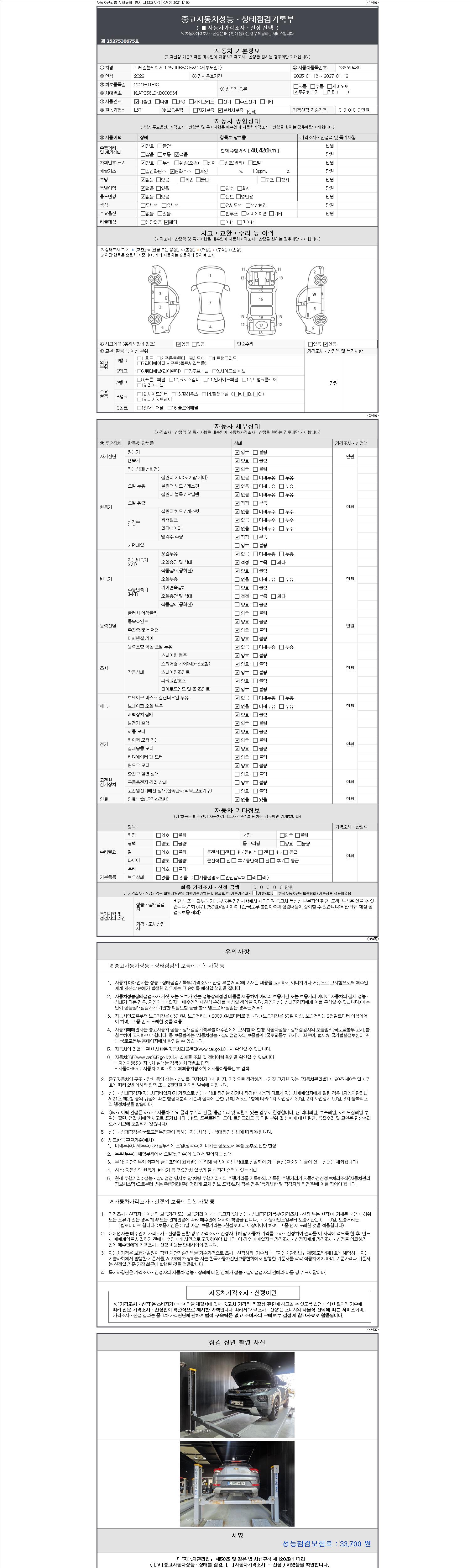 자동차관리법 시행규칙 제120조의 규정에 따라 별지 제 82호서식 《중고자동차 성능, 상태점검 기록부》를 발행한 성능, 상태점검자 및 매매자는 아래의 보증기간 또는 보증거리 이내의 중고자동차, 성능점검 기록부에 기재된 내용과 자동차의 실제 성능, 상태가 다른 경우 계약 또는 관계법령에 따라 매수인에 대하여 책임을 집니다.