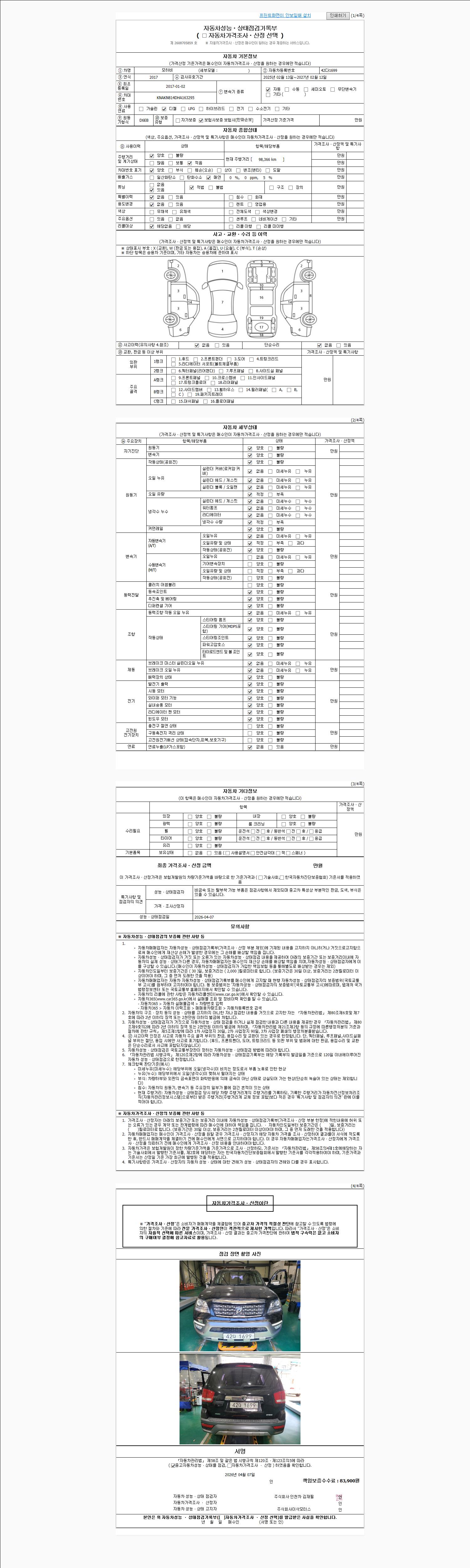 자동차관리법 시행규칙 제120조의 규정에 따라 별지 제 82호서식 《중고자동차 성능, 상태점검 기록부》를 발행한 성능, 상태점검자 및 매매자는 아래의 보증기간 또는 보증거리 이내의 중고자동차, 성능점검 기록부에 기재된 내용과 자동차의 실제 성능, 상태가 다른 경우 계약 또는 관계법령에 따라 매수인에 대하여 책임을 집니다.
