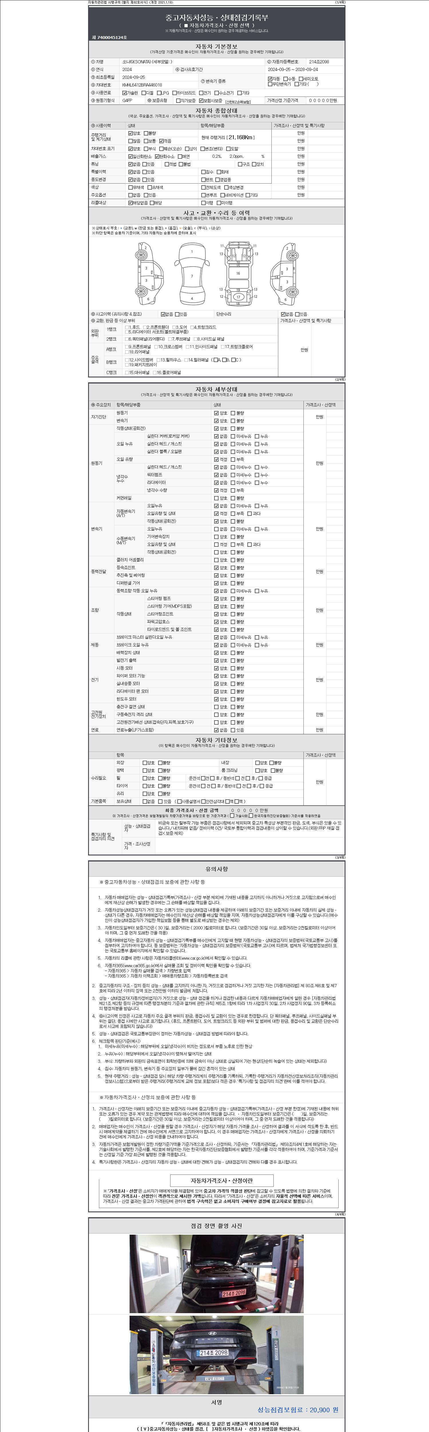 자동차관리법 시행규칙 제120조의 규정에 따라 별지 제 82호서식 《중고자동차 성능, 상태점검 기록부》를 발행한 성능, 상태점검자 및 매매자는 아래의 보증기간 또는 보증거리 이내의 중고자동차, 성능점검 기록부에 기재된 내용과 자동차의 실제 성능, 상태가 다른 경우 계약 또는 관계법령에 따라 매수인에 대하여 책임을 집니다.