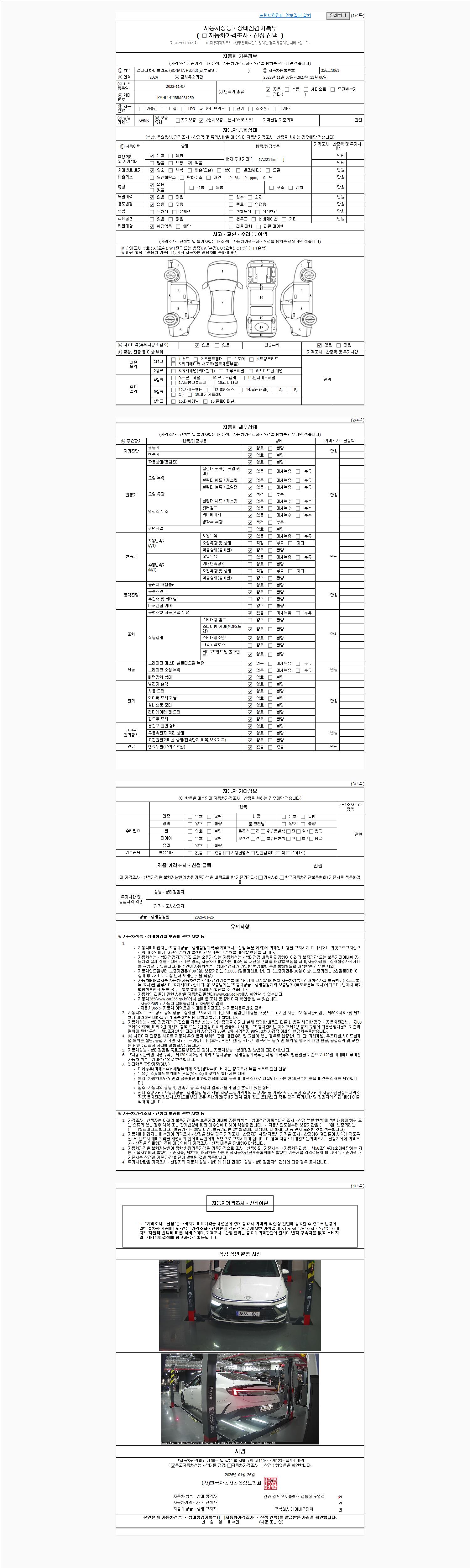 자동차관리법 시행규칙 제120조의 규정에 따라 별지 제 82호서식 《중고자동차 성능, 상태점검 기록부》를 발행한 성능, 상태점검자 및 매매자는 아래의 보증기간 또는 보증거리 이내의 중고자동차, 성능점검 기록부에 기재된 내용과 자동차의 실제 성능, 상태가 다른 경우 계약 또는 관계법령에 따라 매수인에 대하여 책임을 집니다.