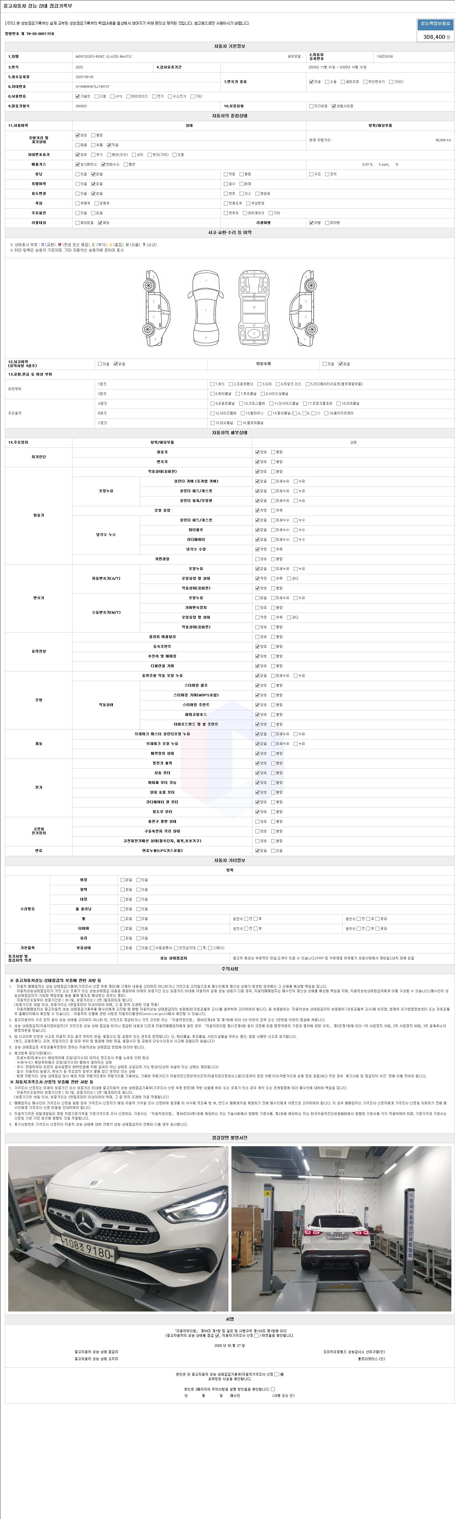 자동차관리법 시행규칙 제120조의 규정에 따라 별지 제 82호서식 《중고자동차 성능, 상태점검 기록부》를 발행한 성능, 상태점검자 및 매매자는 아래의 보증기간 또는 보증거리 이내의 중고자동차, 성능점검 기록부에 기재된 내용과 자동차의 실제 성능, 상태가 다른 경우 계약 또는 관계법령에 따라 매수인에 대하여 책임을 집니다.
