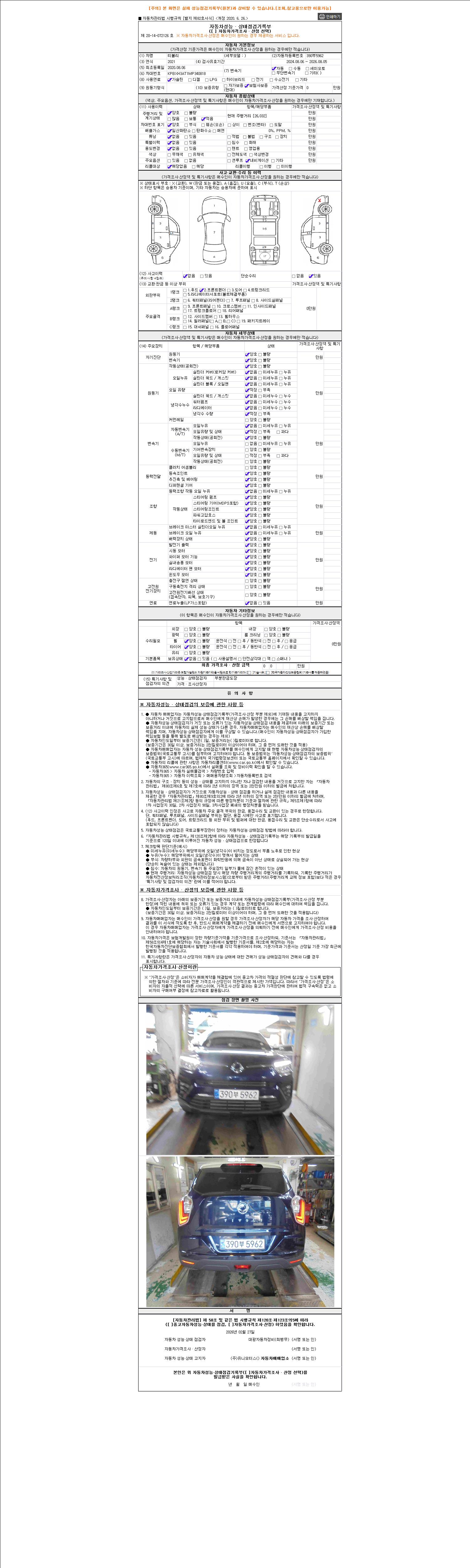 자동차관리법 시행규칙 제120조의 규정에 따라 별지 제 82호서식 《중고자동차 성능, 상태점검 기록부》를 발행한 성능, 상태점검자 및 매매자는 아래의 보증기간 또는 보증거리 이내의 중고자동차, 성능점검 기록부에 기재된 내용과 자동차의 실제 성능, 상태가 다른 경우 계약 또는 관계법령에 따라 매수인에 대하여 책임을 집니다.