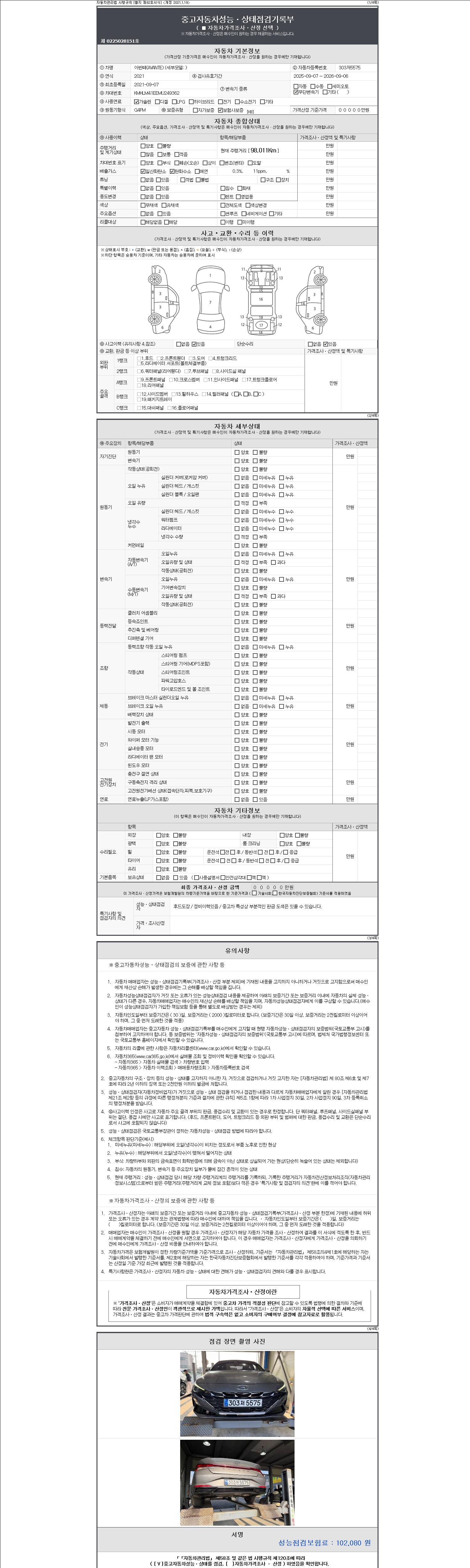 자동차관리법 시행규칙 제120조의 규정에 따라 별지 제 82호서식 《중고자동차 성능, 상태점검 기록부》를 발행한 성능, 상태점검자 및 매매자는 아래의 보증기간 또는 보증거리 이내의 중고자동차, 성능점검 기록부에 기재된 내용과 자동차의 실제 성능, 상태가 다른 경우 계약 또는 관계법령에 따라 매수인에 대하여 책임을 집니다.