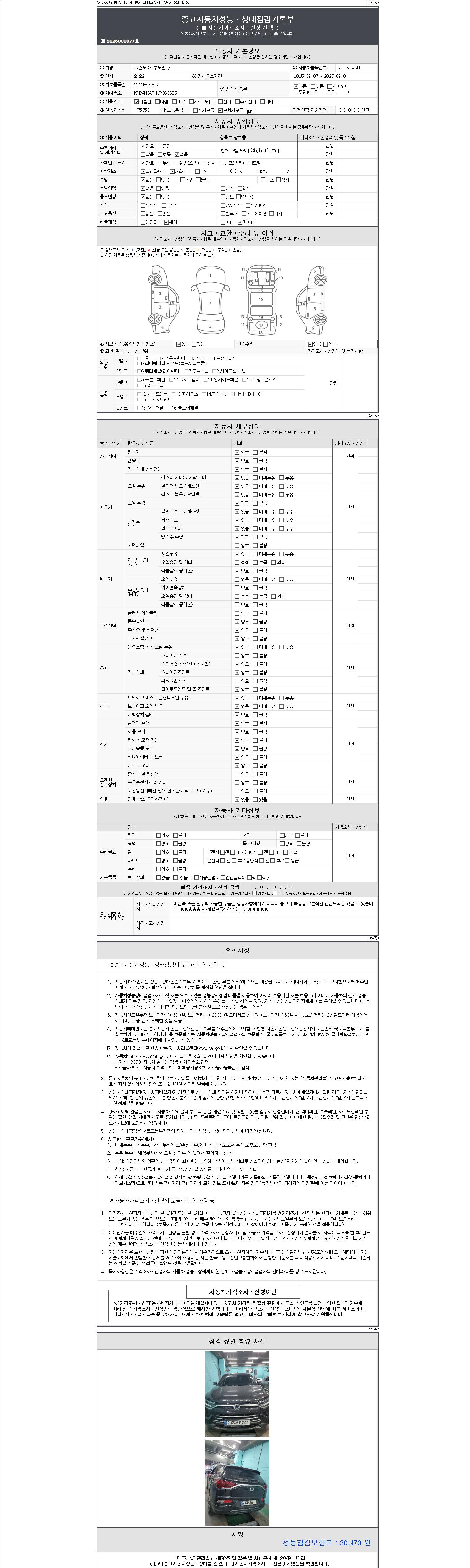 자동차관리법 시행규칙 제120조의 규정에 따라 별지 제 82호서식 《중고자동차 성능, 상태점검 기록부》를 발행한 성능, 상태점검자 및 매매자는 아래의 보증기간 또는 보증거리 이내의 중고자동차, 성능점검 기록부에 기재된 내용과 자동차의 실제 성능, 상태가 다른 경우 계약 또는 관계법령에 따라 매수인에 대하여 책임을 집니다.