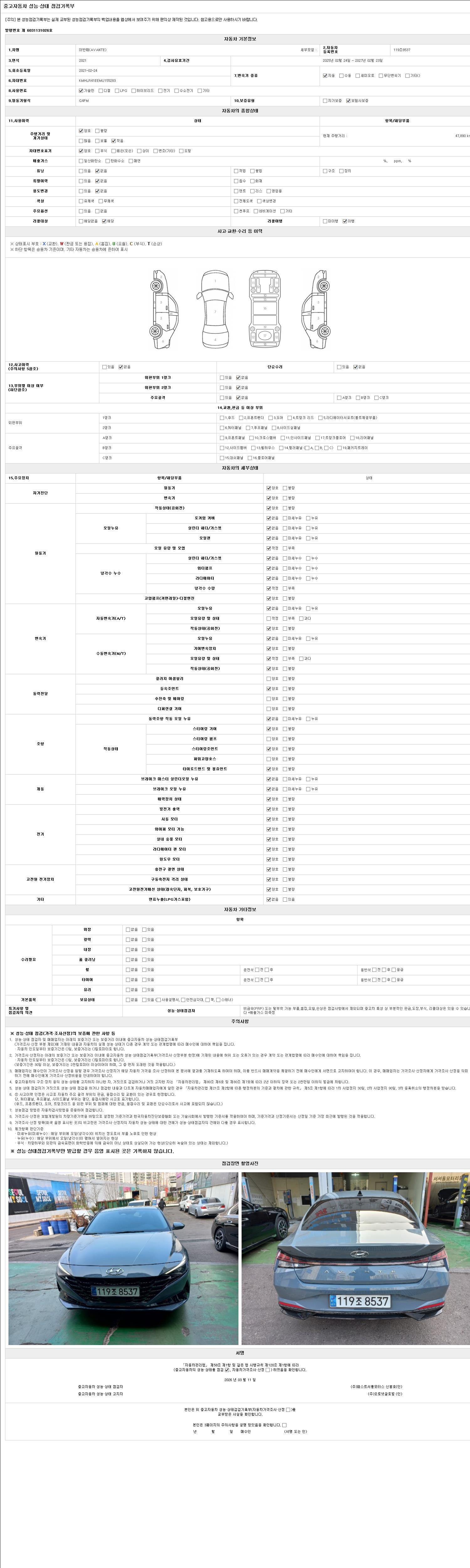 2. 차량 등록증이나 성능점검지 등을 상담자에게 요청및 확인하시고 사전에 미리 점검 하시기를 권유드립니다.
