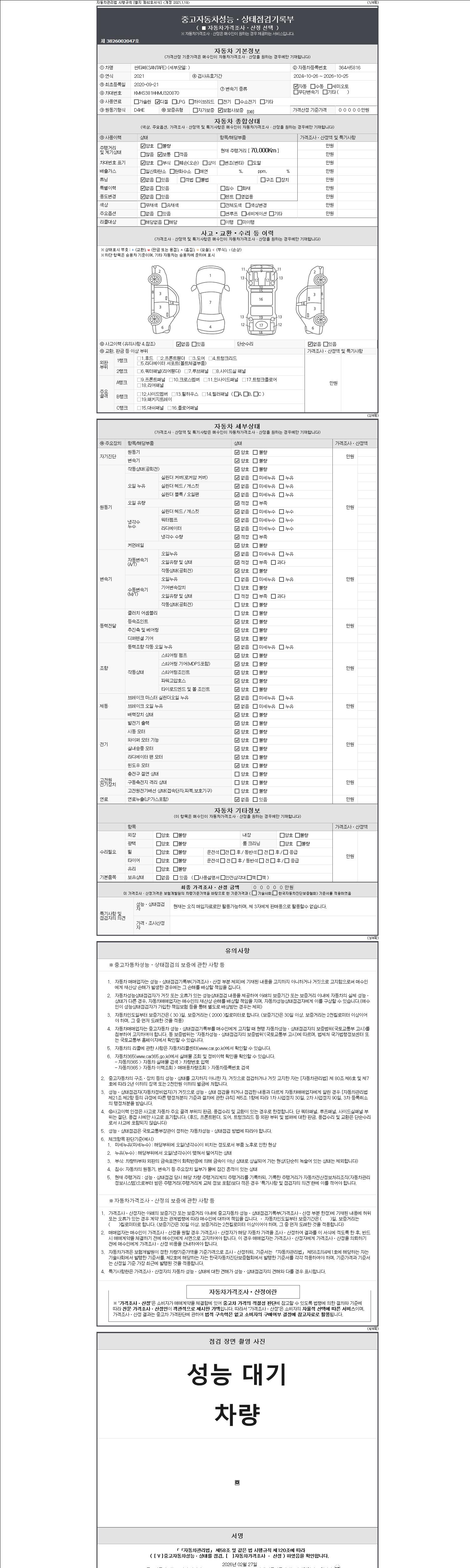 자동차관리법 시행규칙 제120조의 규정에 따라 별지 제 82호서식 《중고자동차 성능, 상태점검 기록부》를 발행한 성능, 상태점검자 및 매매자는 아래의 보증기간 또는 보증거리 이내의 중고자동차, 성능점검 기록부에 기재된 내용과 자동차의 실제 성능, 상태가 다른 경우 계약 또는 관계법령에 따라 매수인에 대하여 책임을 집니다.