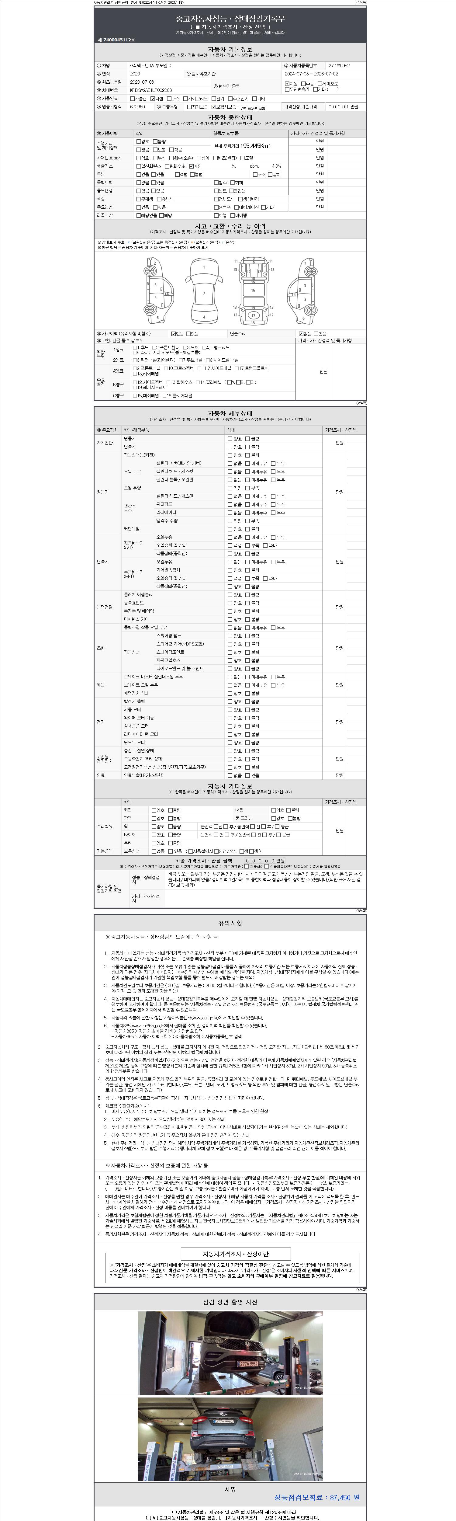 자동차관리법 시행규칙 제120조의 규정에 따라 별지 제 82호서식 《중고자동차 성능, 상태점검 기록부》를 발행한 성능, 상태점검자 및 매매자는 아래의 보증기간 또는 보증거리 이내의 중고자동차, 성능점검 기록부에 기재된 내용과 자동차의 실제 성능, 상태가 다른 경우 계약 또는 관계법령에 따라 매수인에 대하여 책임을 집니다.