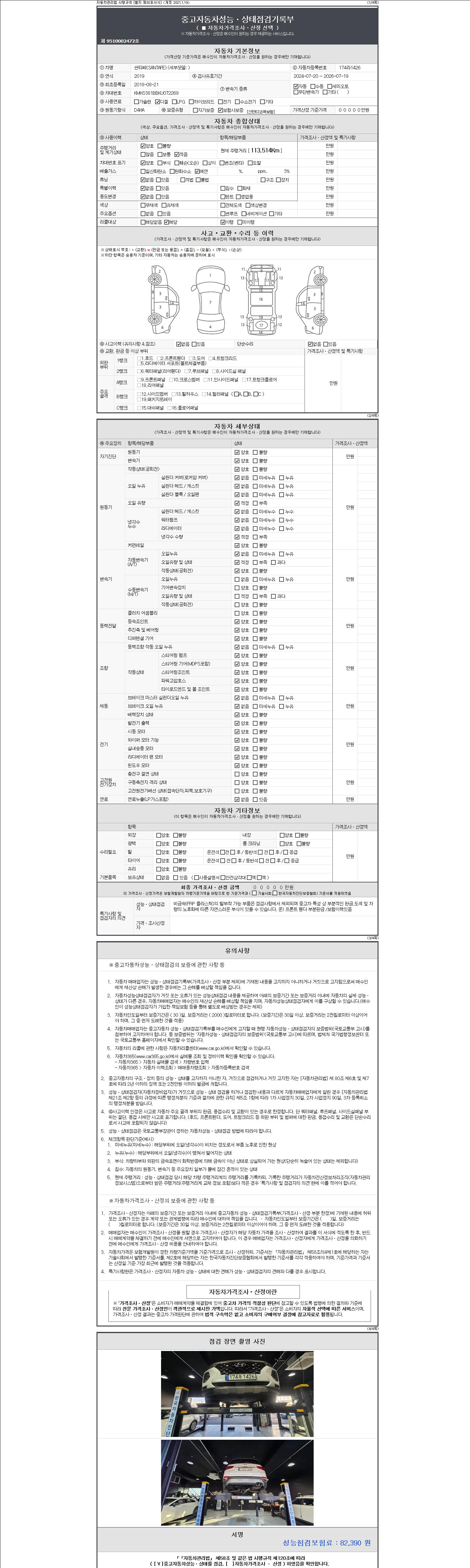 자동차관리법 시행규칙 제120조의 규정에 따라 별지 제 82호서식 《중고자동차 성능, 상태점검 기록부》를 발행한 성능, 상태점검자 및 매매자는 아래의 보증기간 또는 보증거리 이내의 중고자동차, 성능점검 기록부에 기재된 내용과 자동차의 실제 성능, 상태가 다른 경우 계약 또는 관계법령에 따라 매수인에 대하여 책임을 집니다.