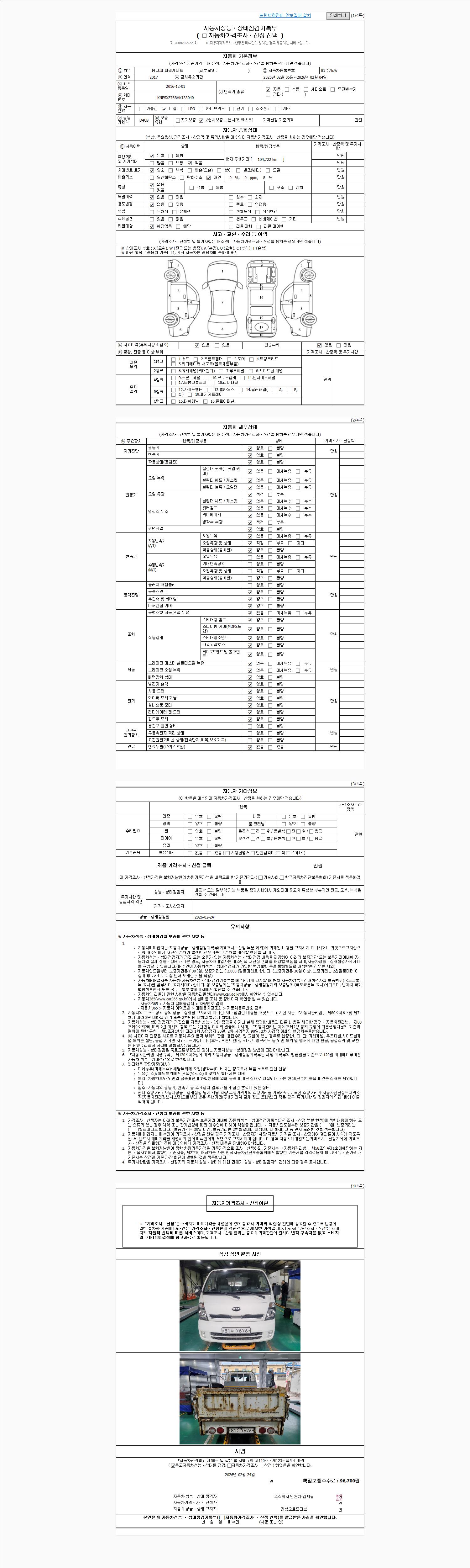 자동차관리법 시행규칙 제120조의 규정에 따라 별지 제 82호서식 《중고자동차 성능, 상태점검 기록부》를 발행한 성능, 상태점검자 및 매매자는 아래의 보증기간 또는 보증거리 이내의 중고자동차, 성능점검 기록부에 기재된 내용과 자동차의 실제 성능, 상태가 다른 경우 계약 또는 관계법령에 따라 매수인에 대하여 책임을 집니다.